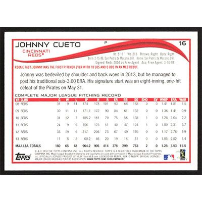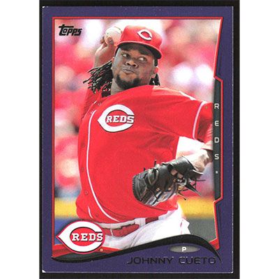 This is a 2014 Topps Toys R Us Purple Johnny Cueto baseball card. The card is #16 and pictures show condition.