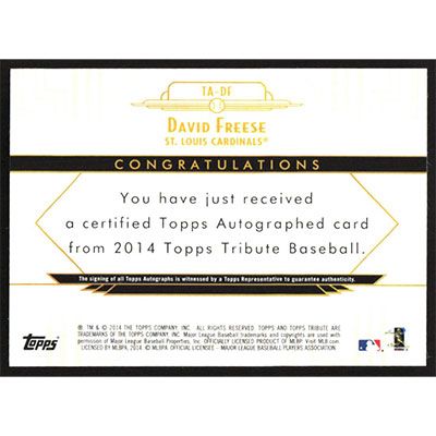 This is a 2014 Topps Tribute Autographs David Freese autographed baseball card. This card has been signed, in blue, by David Freese, and is certified authentic by Topps. The card is #TA-DF and pictures show condition. This card is limited; #'d 78 /99.