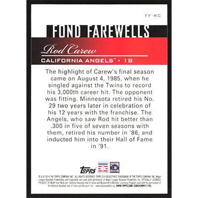 This is a 2014 Topps Update Fond Farewells Rod Carew baseball card. The card is #LL-RC and pictures show condition.