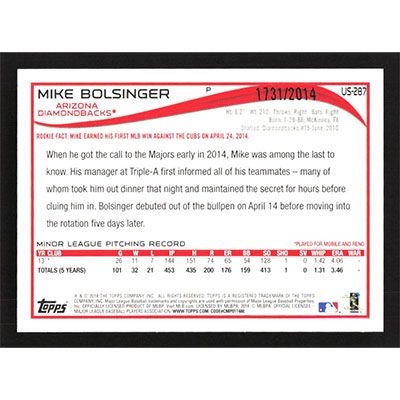 This is a 2014 Topps Update Gold Mike Bolsinger baseball card. The card is #US-287 and pictures show condition. This card is limited; #'d 1731/2014. Team(s): Arizona Diamondbacks Rookie Card (RC)