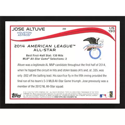 This is a 2014 Topps Update Jose Altuve All-Star baseball card. The card is #US190 and pictures show condition.