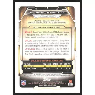 This is a 2015 Bowman Michael Bennett football card. The card is #11 and pictures show condition.