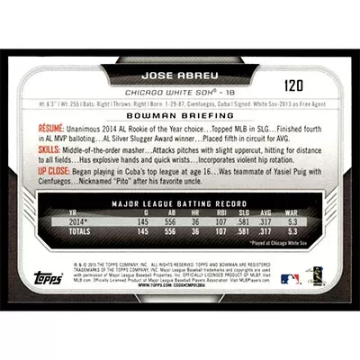 This is a 2015 Bowman Jose Abreu baseball card. The card is #120 and pictures show condition.