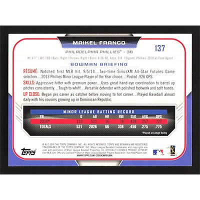 This is a 2015 Bowman Maikel Franco baseball card. The card is #137 and pictures show condition.