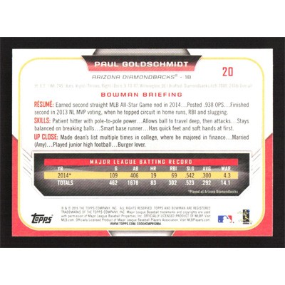 This is a 2015 Bowman Paul Goldschmidt baseball card. The card is #20 and pictures show condition.