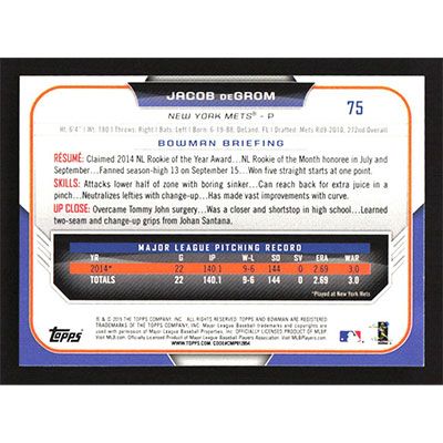 This is a 2015 Bowman Jacob deGrom baseball card. The card is #75 and pictures show condition.