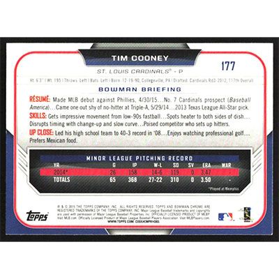 This is a 2015 Bowman Chrome Tim Cooney baseball card. The card is #177 and pictures show condition.