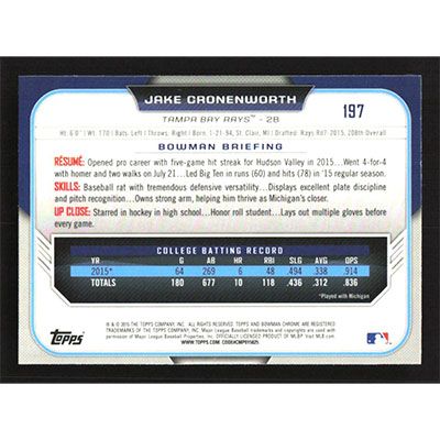 This is a 2015 Bowman Chrome Draft Jake Cronenworth baseball card. The card is #197 and pictures show condition.