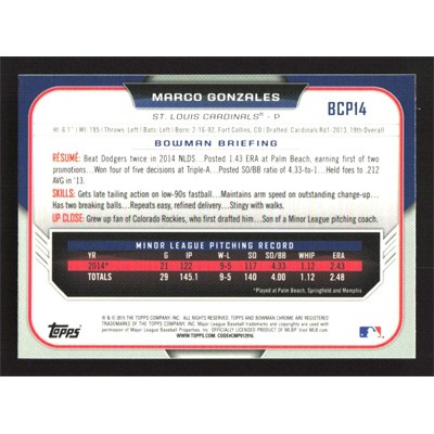 This is a 2015 Bowman Chrome Prospects Marco Gonzales baseball card. The card is #BCP14 and pictures show condition.