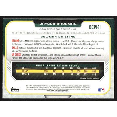 This is a 2015 Bowman Chrome Prospects Jaycob Brugman baseball card. The card is #BCP141 and pictures show condition.