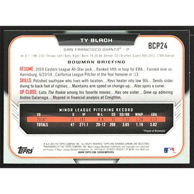 This is a 2015 Bowman Chrome Prospects Ty Blach baseball card. The card is #BCP24 and pictures show condition.