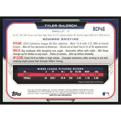 This is a 2015 Bowman Chrome Prospects Tyler DeLoach baseball card. The card is #BCP46 and pictures show condition.