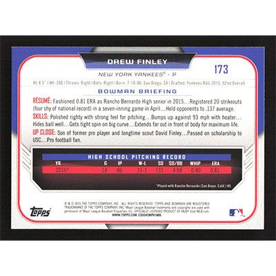 This is a 2015 Bowman Draft Drew Finley baseball card. The card is #173 and pictures show condition.