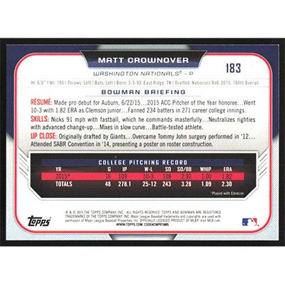 This is a 2015 Bowman Draft Matt Crownover baseball card. The card is #183 and pictures show condition.