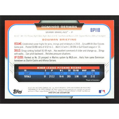 This is a 2015 Bowman Prospects Yellow Domingo German baseball card. The card is #BP118 and pictures show condition.
