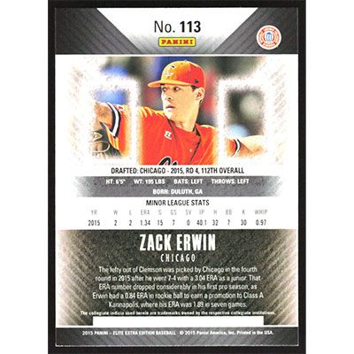 This is a 2015 Elite Extra Edition Zack Erwin baseball card. The card is #113 and pictures show condition.