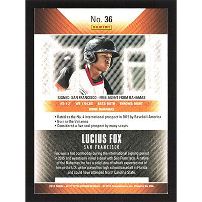 This is a 2015 Elite Extra Edition Lucius Fox baseball card. The card is #36 and pictures show condition.