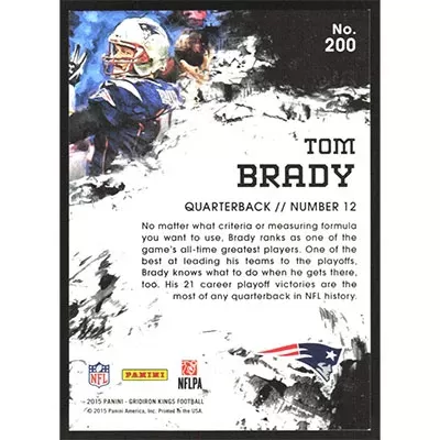 This is a 2015 Gridiron Kings Tom Brady All-Time Stat Kings football card. The card is #200 and pictures show condition. Team: New England Patriots