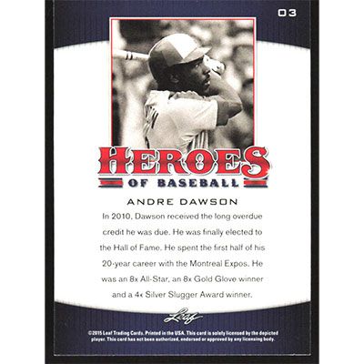 This is a 2015 Leaf Heroes of Baseball Andre Dawson baseball card. The card is #3 and pictures show condition.