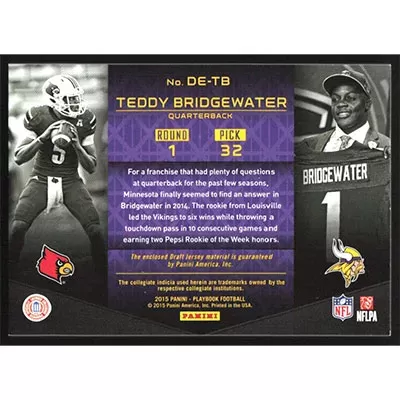 This is a 2015 Panini Playbook Draft Edition Memorabilia Teddy Bridgewater Jumbo Jersey football card. The card is #DE-TB and pictures show condition. This card is limited; #'d 055/199.