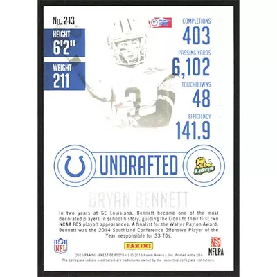 This is a 2015 Prestige Extra Points Green Bryan Bennett football card. The card is #213 and pictures show condition. Team: Indianapolis Colts Rookie Card