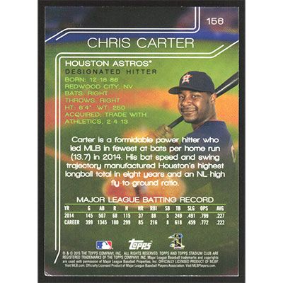 This is a 2015 Stadium Club Chris Carter baseball card. The card is #156 and pictures show condition.