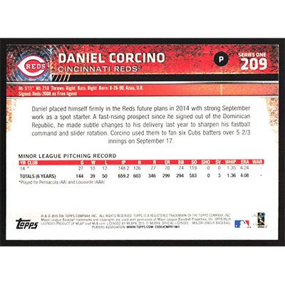 This is a 2015 Topps Daniel Corcino baseball card. The card is #209 and pictures show condition.
