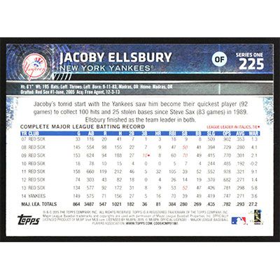 This is a 2015 Topps Jacoby Ellsbury baseball card. The card is #225 and pictures show condition.