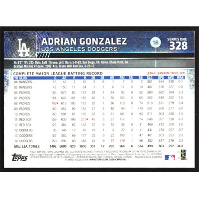 This is a 2015 Topps Adrian Gonzalez baseball card. The card is #328 and pictures show condition.