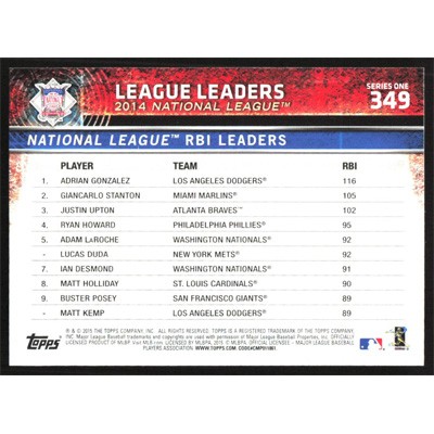This is a 2015 Topps Adrian Gonzalez, Giancarlo Stanton and Justin Upton League Leaders baseball card. The card is #349 and pictures show condition. Team(s): Los Angeles Dodgers/Miami Marlins/Atlanta Braves