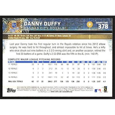 This is a 2015 Topps Danny Duffy baseball card. The card is #378 and pictures show condition.