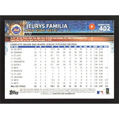 This is a 2015 Topps Jeurys Familia baseball card. The card is #402 and pictures show condition.