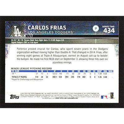 This is a 2015 Topps Carlos Frias baseball card. The card is #434 and pictures show condition.