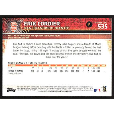 This is a 2015 Topps Erik Cordier baseball card. The card is #535 and pictures show condition.
