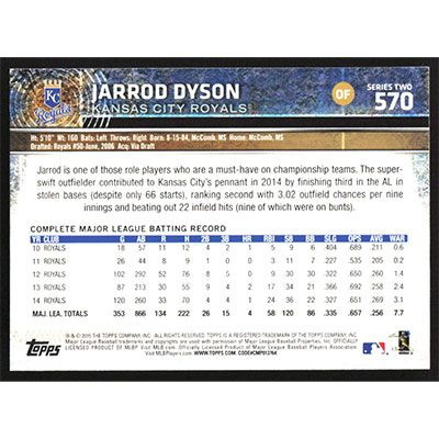This is a 2015 Topps Jarrod Dyson baseball card. The card is #570 and pictures show condition.