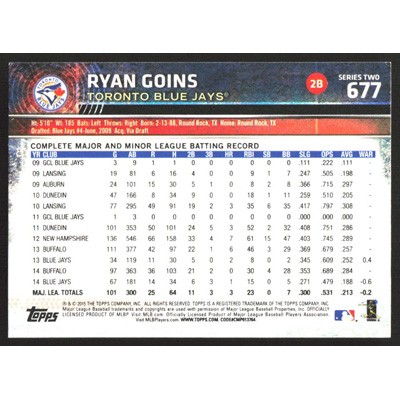 This is a 2015 Topps Ryan Goins baseball card. The card is #677 and pictures show condition.