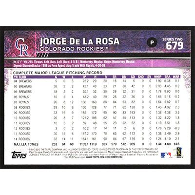 This is a 2015 Topps Jorge De La Rosa baseball card. The card is #679 and pictures show condition.