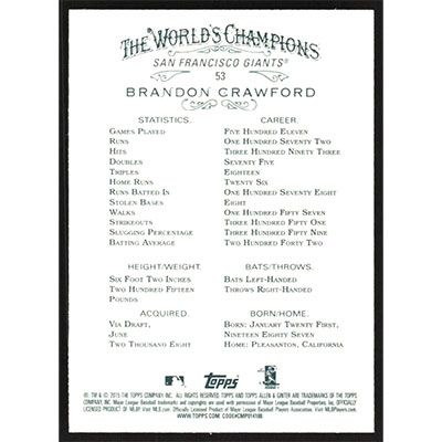 This is a 2015 Topps Allen & Ginter Brandon Crawford baseball card. The card is #53 and pictures show condition.