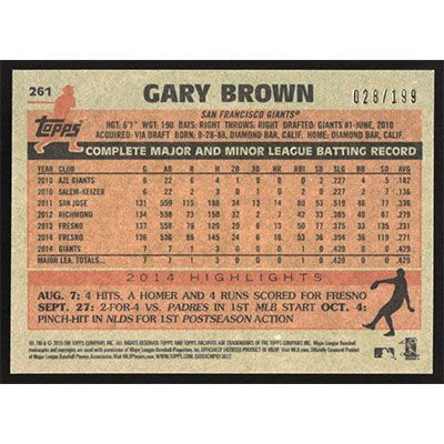 This is a 2015 Topps Archives Silver Gary Brown baseball card. The card is #261 and pictures show condition. This card is limited; #'d 028/199. Team(s): San Francisco Giants Rookie Card (RC)