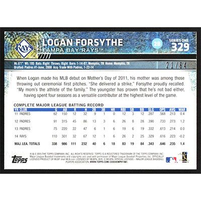 This is a 2015 Topps Black Logan Forsythe baseball card. The card is #329 and pictures show condition. This card is limited; #'d 21/64. Team(s): Tampa Bay Rays