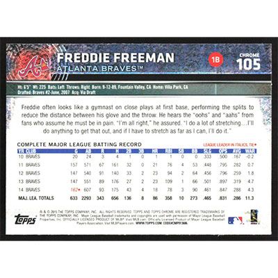 This is a 2015 Topps Chrome Freddie Freeman baseball card. The card is #105 and pictures show condition.