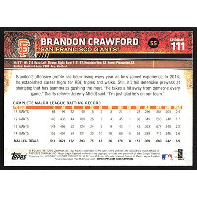 This is a 2015 Topps Chrome Brandon Crawford baseball card. The card is #111 and pictures show condition.