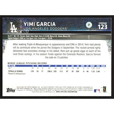 This is a 2015 Topps Chrome Yimi Garcia baseball card. The card is #123 and pictures show condition.
