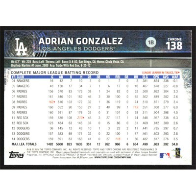This is a 2015 Topps Chrome Adrian Gonzalez baseball card. The card is #138 and pictures show condition.