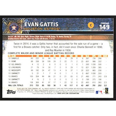 This is a 2015 Topps Chrome Evan Gattis baseball card. The card is #149 and pictures show condition.