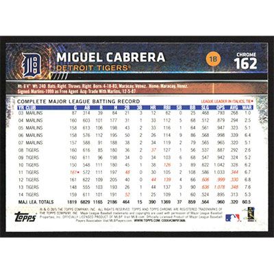 This is a 2015 Topps Chrome Miguel Cabrera baseball card. The card is #162 and pictures show condition.