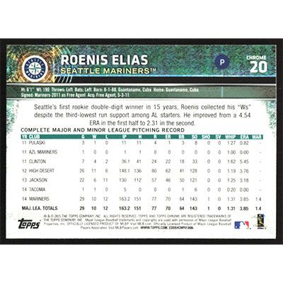 This is a 2015 Topps Chrome Roenis Elias baseball card. The card is #20 and pictures show condition.