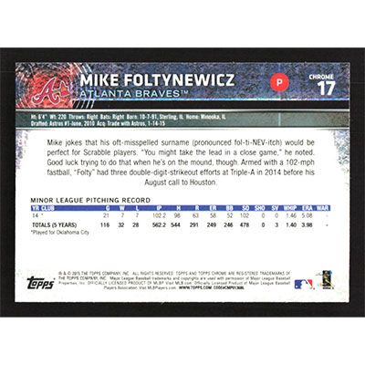 This is a 2015 Topps Chrome Pink Refractors Mike Foltynewicz baseball card. The card is #17 and pictures show condition. Team(s): Atlanta Braves Rookie Card (RC)