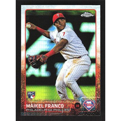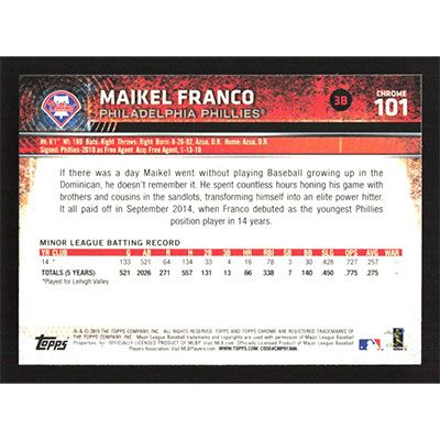 This is a 2015 Topps Chrome Prism Refractors Maikel Franco baseball card. The card is #101 and pictures show condition. Team(s): Philadelphia Phillies Rookie Card (RC)