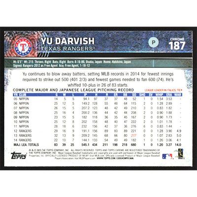 This is a 2015 Topps Chrome Refractors Yu Darvish baseball card. The card is #187 and pictures show condition.